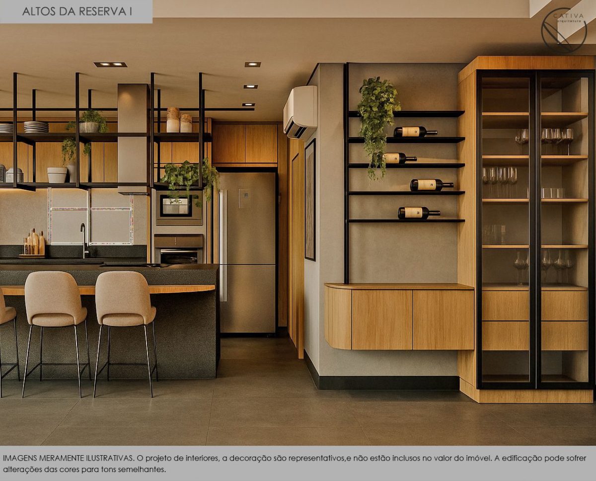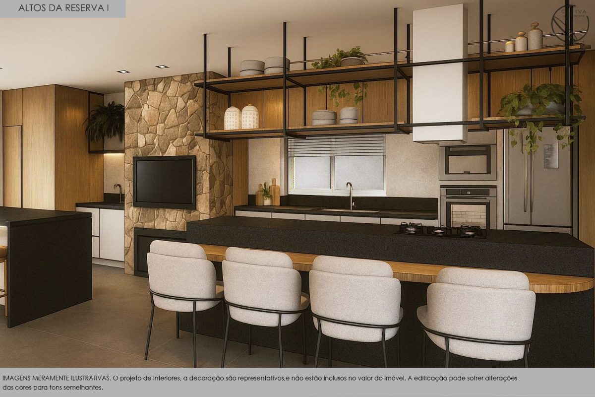•⁠ ⁠⁠Cozinha: Móveis fixos, estruturas metálicas, bancada em pedra, forno, microondas, coifa, cooktop e torneira.
